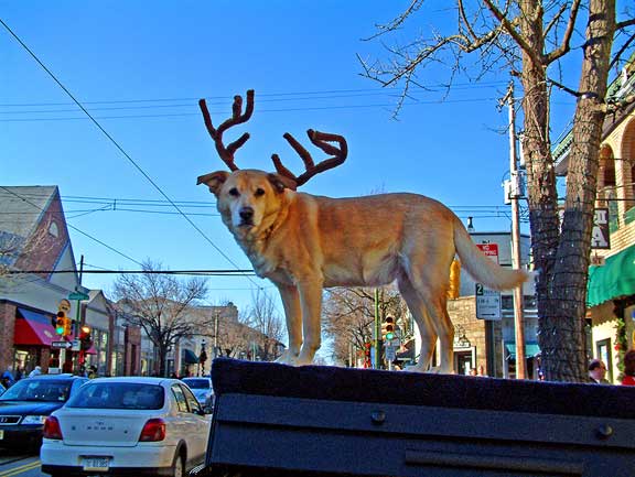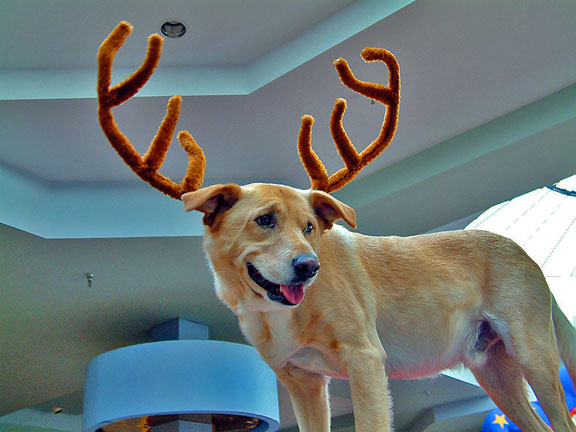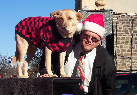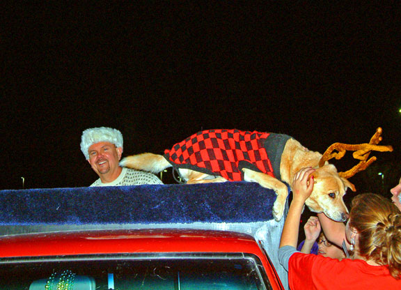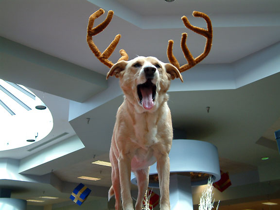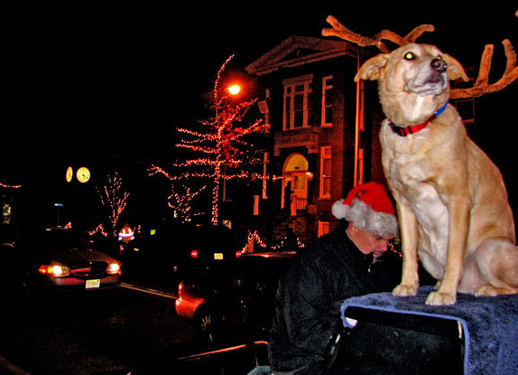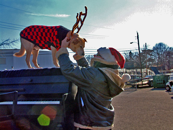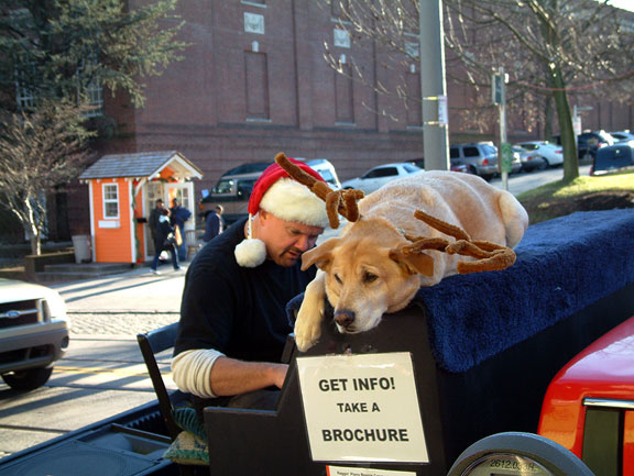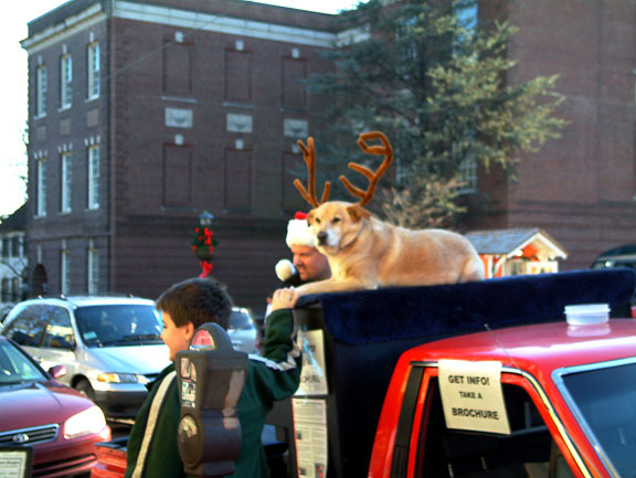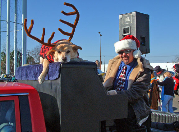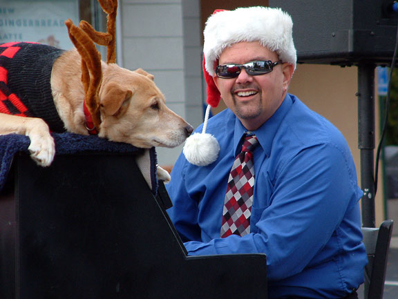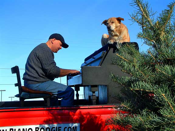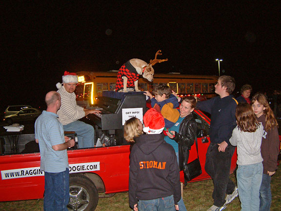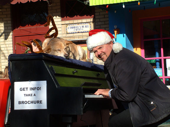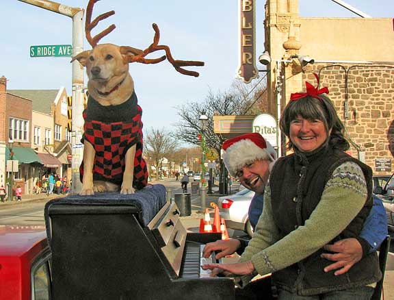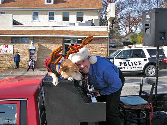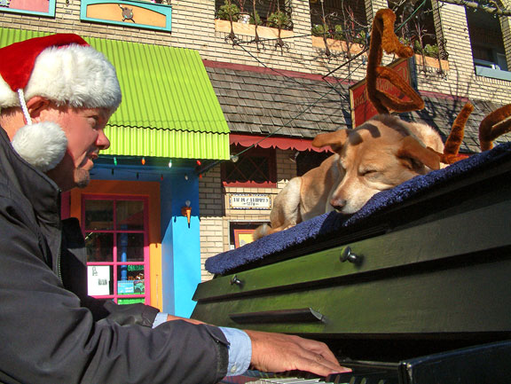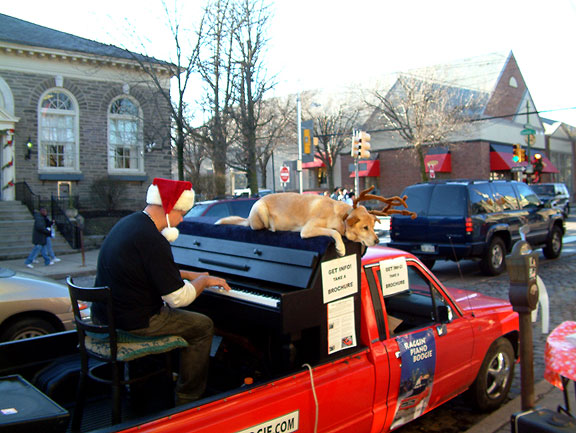 Wish I had been home in October for my yearly flu shot. Too late... its been about four days now, glad I am not on the road moving to a new location every two days meeting new friends. Who wants to make friends with the flu man? Ha... I think I'm through the worst of it. I do feel a little pressure with this site not having new activity everyday but I remind myself constantly, I have no obligations or expectations all of my work is a labor of love. Gotta remember that. I still take Bo outside everyday for a bit even if I feel under the weather. A little bit because it is in the teen's out there, it is cold! Flu or not I would not be outside with the Traveling Piano. In my younger days... if there were places close by... if there was a purposeful agenda... I might, warmer weather definitely but right now I need to get centered and ready to leave for a long period of time. The pictures today are from many moons ago a Christmas parade and once when I drove Raggin' Piano Boogie indoors into a mall to create music for Santa's arrival. This was Boner's first day wearing his reindeer antlers.
