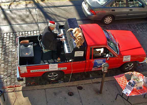 I drove back from Canada to travel South. I wanted for Boner not be cold hanging out on top of the piano. I got as far as Pipersville, PA and thats not too far South. With Las Vegas reporting one foot of snow today its pretty clear I am where I am supposed to be at the moment. Only problem is im getting sick, maybe? First time in years. I'm moving through it with not too clear a head but hey, has my head ever been really clear when moving through anything? If it has, when I am feeling like I am now I can't remember if ever. I'm not playing piano and creating the Traveling Piano for others and I must say that it surprises me how much it affects my mental and emotional stability. Hmmm... For Christmas I am going to post some of my favorite Raggin' Piano Boogie and Traveling Piano Christmas pictures from the past. I wish they were from the present buy hey, "it is what it is". These are moments of Christmas fun to remember. The first picture is with a four hundred and fifty pound, six foot eight santa claus sitting on my lap in Ambler, Pennsylvania. This guy was for real!!!The second picture is in Chestnut Hill, Pennsylvania. Merry Christmas!