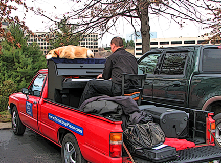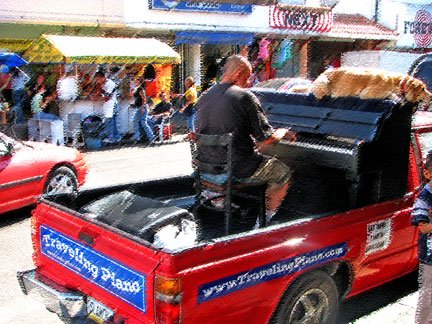 I had a box that I never opened... for years I have seen it here and there. It said Tripp-Light invertor on the packaging and I have often thought, "why did you buy this, when did you buy this, why do you have it, what is it for." I found it today in my friend Charlie's cellar. I opened it to find a brand new 2000 watt inverter which will create the power for the new Traveling Piano equipment, a $700 item. Whew, that saved a lot of cost. I'm already into this truck in the 20's of thousands. My retirement fund :) ...for real. I revamped the Traveling Piano website today. Created new text and added a wonderful photo gallery that I will be adding to every week. It is really great, check it out! The Traveling Piano Website Click on the grey PHOTOS link at the top of the page, on the right.