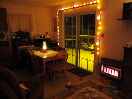 The bed in the house I have been staying in has been busted for a long time which has resulted in my sleeping with a mattress on the floor. I purchased a new bed for the place that was delivered today. I don't have the loose funds to have done that but I don't care about how much or how little money is left. It took four hours to put the bed together and I am proud of myself in being able to have done it. Tonight Mo and I will be sleeping in a new bed of comfort. I wonder how long this stay will last before we take off with the journey again. My being here in West Virginia has been continuously providential. The bed purchased, cost a lot of money for what will be so little use but I remind myself it is for the use of the family who has let me stay here as well as for myself. They have given me stewardship of their home without any obligations or expectations. I could almost cry with gratitude. Right now I am sitting in a perfect recliner chair with Mo between my legs sleeping. It is night time and I am watching a white steady stream of snow fall in path of a yellow porch light... outside two sliding glass doors. The backdrop is a dark forrest trees. There is a kerosine lamp glowing on the kitchen table. Soft multi colored ball lights frame the windows and doors. The propane heater is like having a fireplace. The new bed and my having made arrangements for renovations that are almost finished... I have been contributed to and so I contribute.