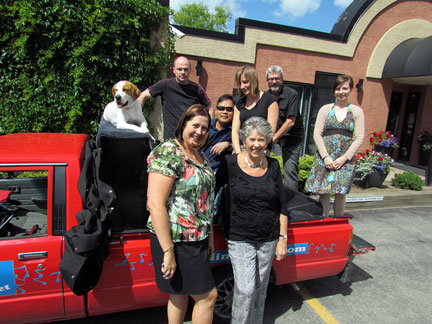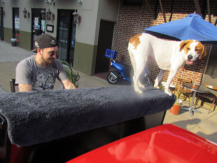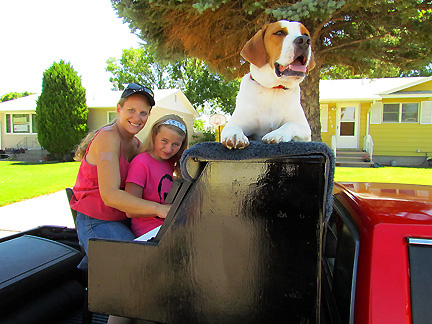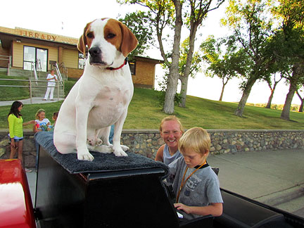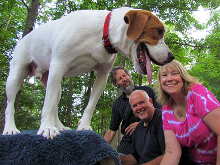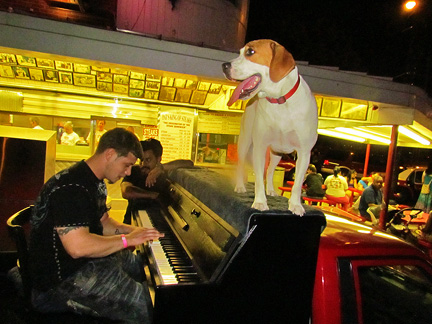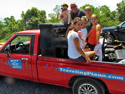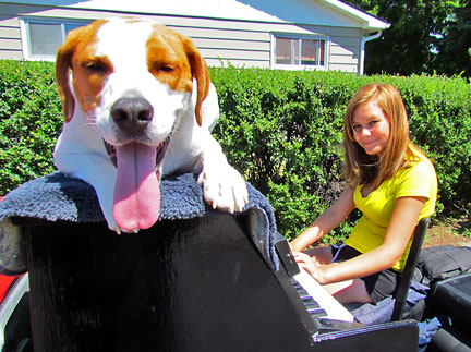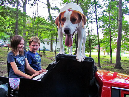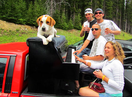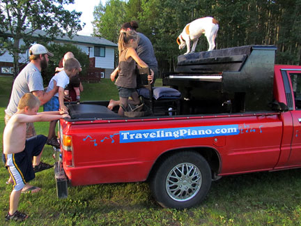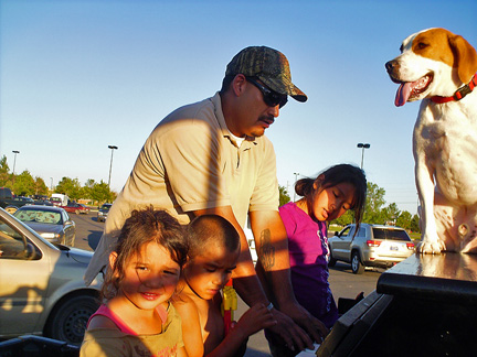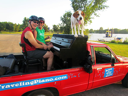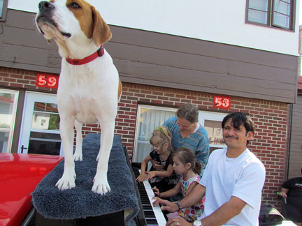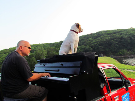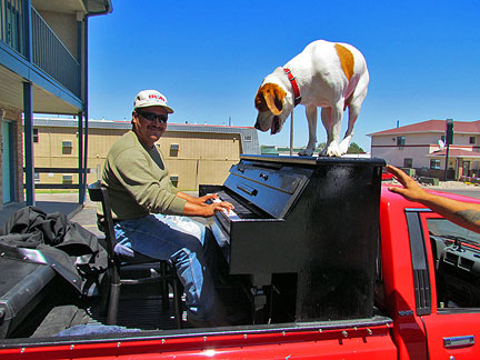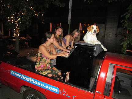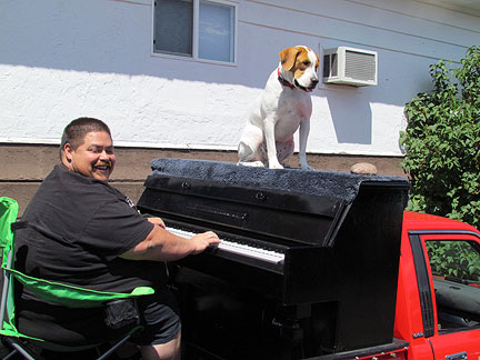 Afterwards we stayed around for hours while people met Mo, jumped onto the truck to create music as usual and I met a guy named Andy and drove him around town while he jammed on the back of the truck. Onward to my high school friend Patty's house for a barbecue with old friends. Patty gave me the idea for putting the piano on the back of a truck and helped me get started with promoting it twenty five years ago. To be with old friends and watch us age is amazing. I had a lot of fun eating and Mo... he ate up all the attention he could get and whatever he can find on the ground.