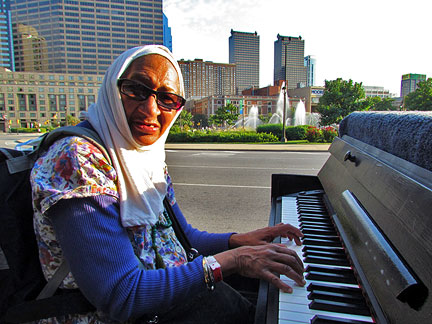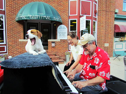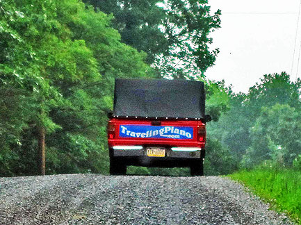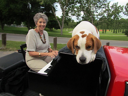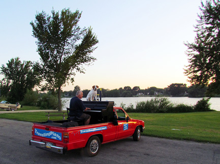 About two in the afternoon on a whim I decided to randomly call someone in my travel book to see if they would like a last minute visitor. Wow! Jean and Lou responded without hesitancy and so about seven hours later I ended up in Geneva, Illinois about forty miles West of Chicago. It used to be the town outside of Chicago at the end of the railroad line where old ladies used to take a ride to shop. It is now a city and there are two more railroad stops after it. How fantastical that I can phone people and ask if they would like a visit from a strange piano man will arrive to stay the night with his piano in the back of a truck and with his dog who sits on top of the piano... and they welcome us with open arms having no idea who or what we are about. People who enjoy, are interested in and want to learn about other people with trust. This is the best of life... people open to and willing to explore relationship with humankind. Immediately I began meeting people in town, a really nice town! One ladies said, "I can't believe this tightly wound woman got up onto a truck to play a piano." She had never tried to create music before.