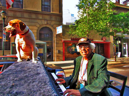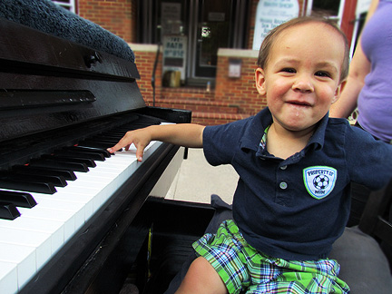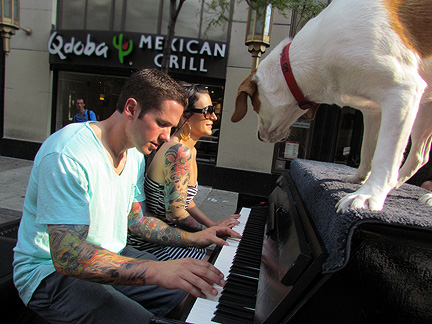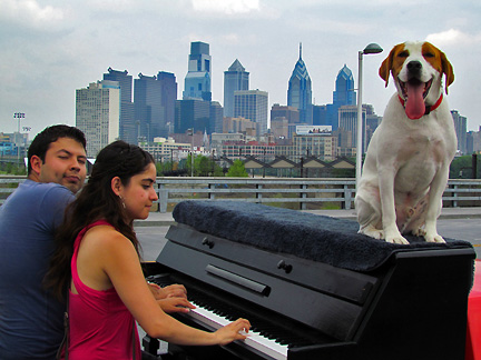 Again, I took my computer to get repaired and as a result ended up on 16th and Walnut street in center city. I was there for hours. While I was in the shop which was a major hassle and drag trying to get people to do their job... Rosbel and Franz took over my job outside on the street and directed people up onto the truck to create music and then they took pictures for me. Lots of people were looking to be entertained. Lots of people had a chance to entertain themselves... and they did! It was very much fun. I had my water with me today but still not enough. My friend Ed said that the Traveling Piano is my "raisons' etre." I looked that up on the internet... yea, I guess it is. That scares me a little for some reason. In any case Piano Dog Mo inspires me to pursue my "raisons' etre." :)