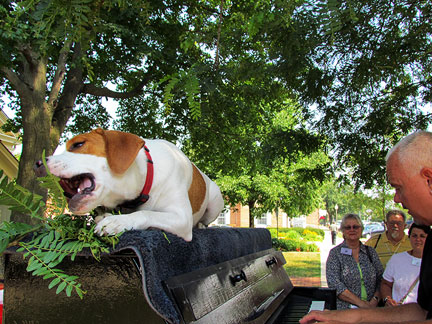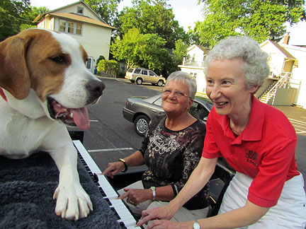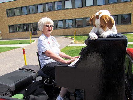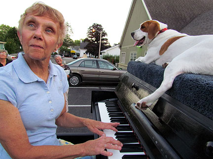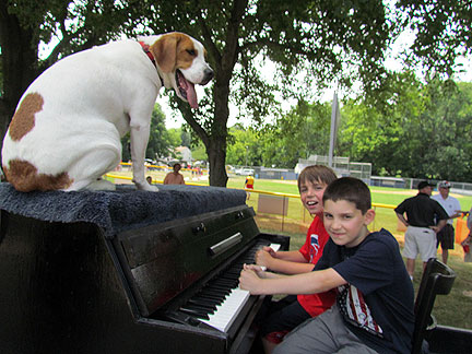 My new friends asked if I wanted to go to church with them. Hmmm... how could I not? Jean is a retired educational psychologist and Lou is a retired corporate lawyer and a secular humanist and they both belong to the Geneva, Illinois Unitarian Universalist church. The music chosen for todays service offering... jarred my sensibilities. It was so much fun! I asked Lynn the church piano player to come outside and play it afterwards on the Traveling Piano! Check it out... Church Offering Music ...Mo sat on top of the piano and chewed the tree limbs from above while people tried out the piano. By the way, I learned that I won't make friends with people from Illinois if I do not say the state name correctly. There is no "S" pronounced at the end of the word Illinois .