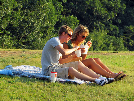 A young couple happened by for the mountain sunset by the lake with blanket and chinese food. What a find for them eh? Their own piano man with piano added to the occasion. A family from my original home town area happened by on their way traveling south. I was thinking since it is so humid and I am wet that I wouldn't need water. Sometimes I scare myself with my thinking. I ended up running to the lodge and drank almost a gallon straight down.