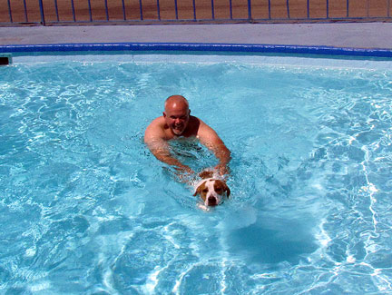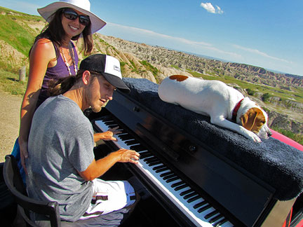 I decided to stay an extra night in the area. I felt a strong impulse to check out the the Badlands, a national park. The day started out with a Mexican guy jumping up onto the piano outside my motel room. He wanted to bang out a few musical notes and have his picture taken. After that Mo and I took a Traveling Piano journey break and went for a swim. It was especially fun because there were no people around. The water was perfect and the temperature outside was in the nineties. Mo found his way into the water by sort of slipping in and then I caught him. That was our first time in a pool together. This was great!