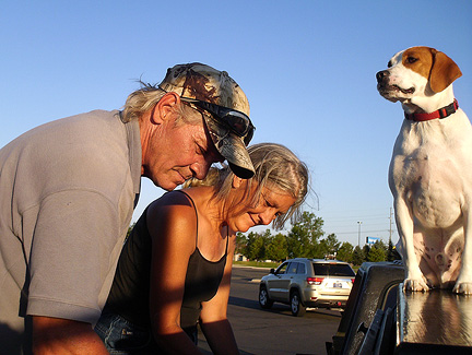 Before heading back to where I am staying Vaclav wanted to stop at a shopping center to get a few things. Within seconds people began stopping by, a local musician from Montana, a dad with his kids from the Northern Shawnee Indian nation, a really nice couple who have been living on the road for years... the couple in their late fifties work by day going door to door to solicit small jobs enough for a nights hotel room. If they don't make enough money in a day for a room they pitch a tent somewhere. Earning enough money for several six packs of beer comes before earning the money for a hotel room. Back at Vaclav's house I played for the neighborhood, it was getting dark. A young neighborhood kid jumped up and a young Ukrainian girl named Nataliya, a guy named Matt... Vaclav was too chicken.