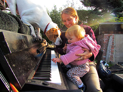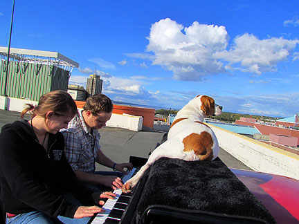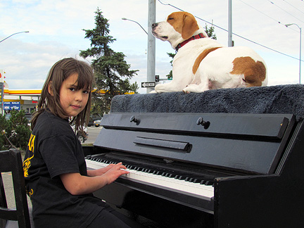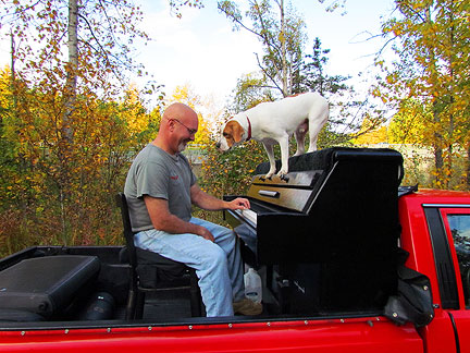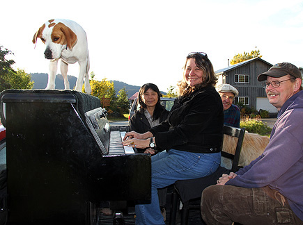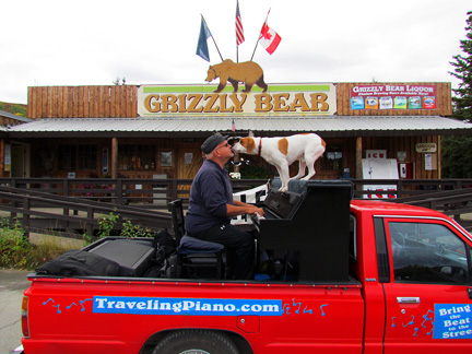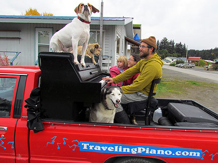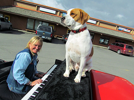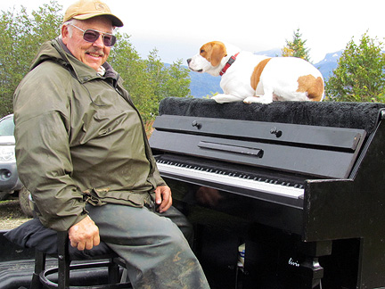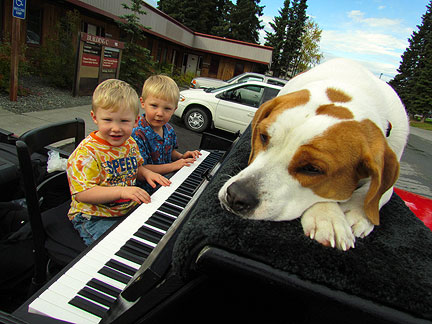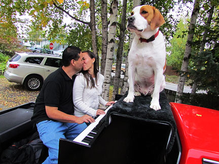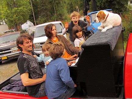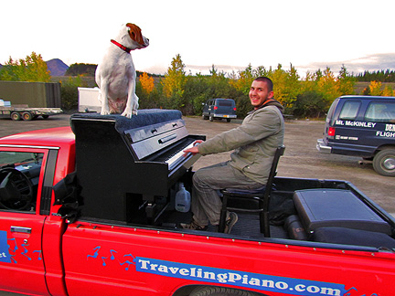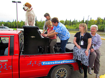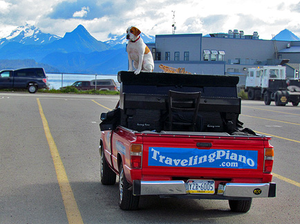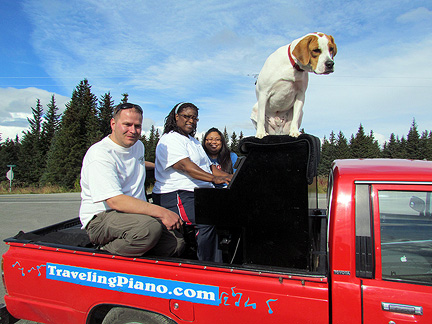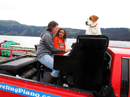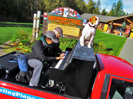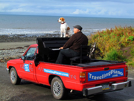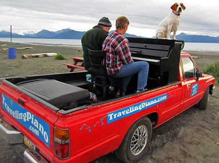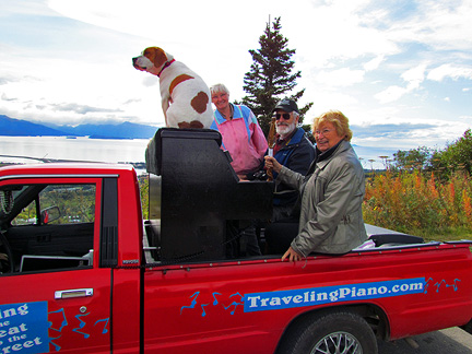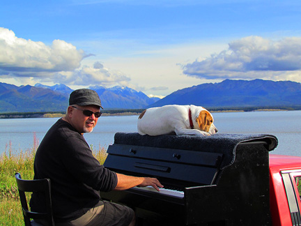 On the way driving out of Knik to Anchorage we stopped in Wasilla to meet Raymie the son of Joe Redington who was the Father of the Iditarod Trail Sled Dog Race. He and his wife jumped onto the Traveling Piano and also a friend of theirs. Driving onward... the mountains are indescribable, as I may have said before, I have always been an ocean boy but now also have a passion for mountain scenery and hiking. They never look real to me here in Alaska. Usually they have a slight cloudy gloss over them that make them look like painted pictures. There was a fender bender on the highway which resulted in miles and miles of rush hour traffic backed up. Ahh... back to the city. Luckily, it was all coming out of Anchorage in the opposite direction. Once I got into the city center, glass, concrete and steel were the words that came to mind... culture shock, back in an urban environment! I am staying with a new friend Christine. She chairs the Alaska Highland (Scottish) Games which I am told is a major event here in Alaska. We were in her driveway when Mo saw the neighbor dogs across the street and off he went. I used the excuse to draw Roger, Christine's neighbor over to the truck, a true go for it kind of guy... he wasted no time in having a go at the piano and then his wife joined him.