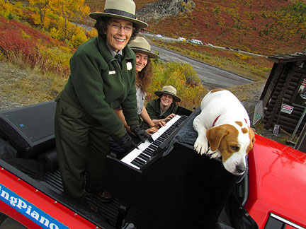 I had my first taste of a watermelon berry today. There are lots of berries in Alaska for the picking' right now, everywhere! Huckleberries, currants, blueberries, high and low bush cranberries. raspberries, salmon berries and more. It is just a berry lovers dreamland! The Traveling Piano day started out with my creating music for a bunch of sandhill cranes. They were not interested. On a drive out to the main road I stopped where a bunch of cable workers were having lunch. They were not interested. Do you know the kind of people who impulsively say no to everything and have no idea what they are saying no to? Onward... I was driving down a paved road and hit gravel, dirt and rocks without notice. Ouch! There were two, grey bearded, very backwoods hunters packing up their gear where I turned around. They thought Mo was cute and gave me a very uneasy, queasy sort of dueling banjos type of feeling.