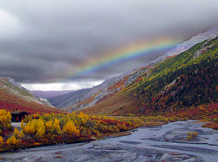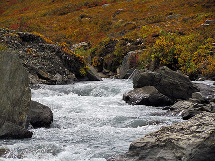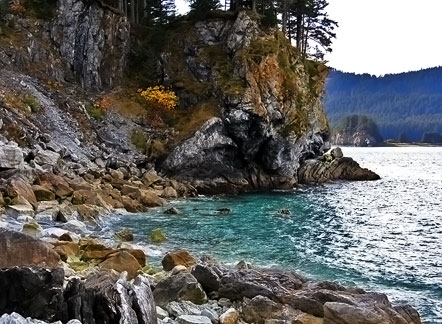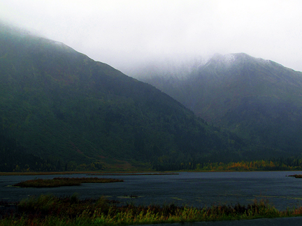 Today we took off for Kenai, Alaska. It was raining, cold and windy. I stopped and Beluga point outside Anchorage to see if there were any whales around and sat for hours hoping the rain would stop so I could see the scenery on the way down. No wales and the rain did not stop.It was cold enough while driving that I considered my winter gloves and had the heat on. The wind was so strong I had to keep a strong arm on the steering wheel. My thinking, "I am getting my fill of fall with the amazing vivid colors." I never saw so many shades of green and yellow especially with the rain. It was like a picture who's color is over saturated. I loved the amazingness. I could see it raining with the fall colors and look up a little way to see a wintery snow at the same time covering the mountain tops. Streams of fresh water rushed down the mountain sides and water gushed out of rock on the sides of the road. The mountains were endless, luscious, spacious, rounded and layered with cone shaped tops. The Kenai river was the most beautiful river I have seen to date. I have seen glacial lakes but never a roaring river of pure rich blue and turquoise color. Areas reminded me of what a fjord would look like. Maybe they were fjords? The rain created just a different kind of beauty today than the sun would have created.
