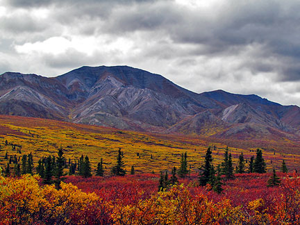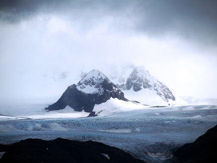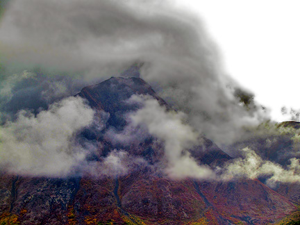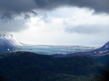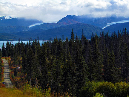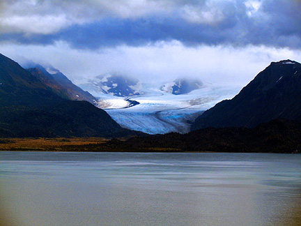 Everytime I think I have experienced the worst possible road I am wrong. There is always better and worse. Today's potholes broke all past records. I drove down a road where some of the holes were over a foot deep and there was no getting around them but I made it through... to and from. The road I drove on was above Homer and I had no idea where it was going to take me. I was looking for the end. I found it. Along the way, the line of view was of the fall trees and then behind that was sea water, then mountains and then glaciers... I just never tire of it. Look at the picture I posted. I could not get the bright fall trees or the water in front but did get the mountains and a sea of glowing blue glacial ice moving down into them. On each side of the ice... mountains of snow. From above, a storm surrounded the glacier. Going down to the end of the road I wondered if I was going to be able to get back up. I was glad the road was not wet. It would have been slippery mud.