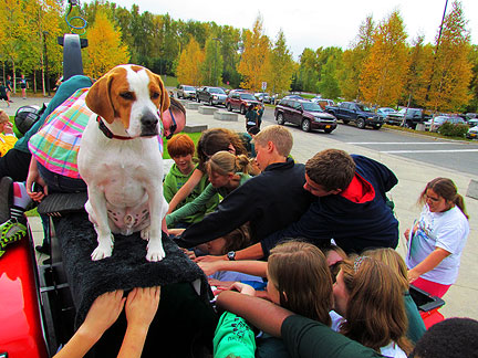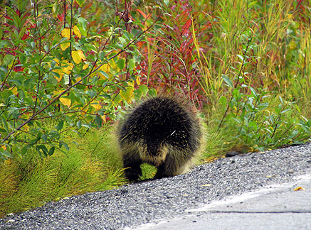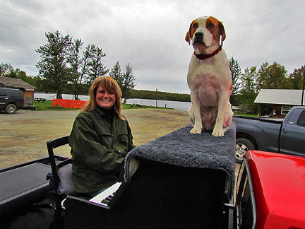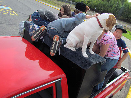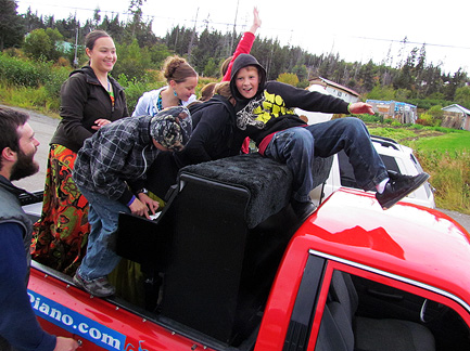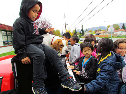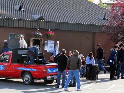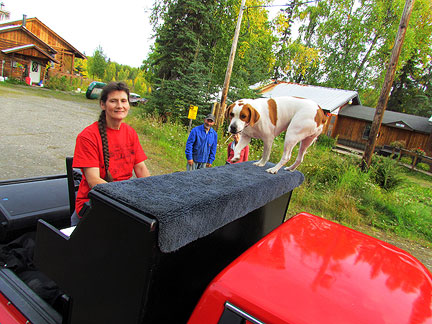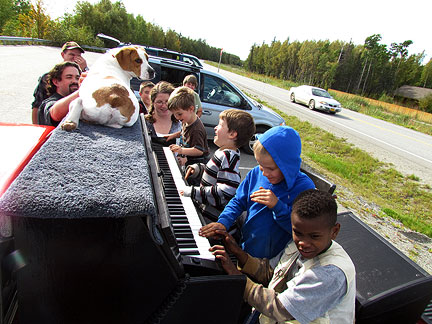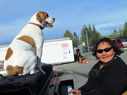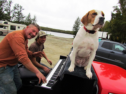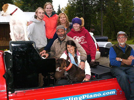 I caught the tail end of a porcupine walking down the road. An elementary school full of kids climbing all over the Traveling Piano before they got onto their buses to head for home. Their school teachers followed with a bit more of civility. I visited a german lady who makes great pizza and she gave me some bagels for the ride out. A family of six found us and we had some fun. A lady working at a store called Mikes-Mart had her two little dogs walking on the piano keys. I went to visit a guy named Red who grows potatoes and chickens. On the way I got lost ending up outside an old cabin where I met a guy named Joe who is a champion musher having won the Alaskan Iditarod in 1980. His wife from England jumped onto the piano to play a few notes.