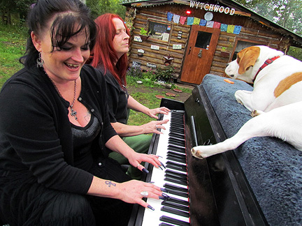 We took off today to hook up with Coley a military guy I met on the road when first entering Alaska. He offered his place to share if I got into his neighborhood. He was incredibly patient and considerate with me going back and forth concerning the day I would arrive. On the way I stopped at Witchwood and met two witches. I asked the head witch if she was a good witch or a bad witch and she said, "yes." We had some fun. There was a little apprehension on arrival at Coley's place having no idea what to expect. He's a single guy in his forties... army, did a year tour in Iraq and two years in Afghanistan and he just finished working the Alaskan state fair for two weeks. Coley is the first military guy I have met to interact with as a friend. I felt comfortable immediately with both him and his friend Aarin who is in the airforce, visiting. Aarin jumped onto the piano for a pic.