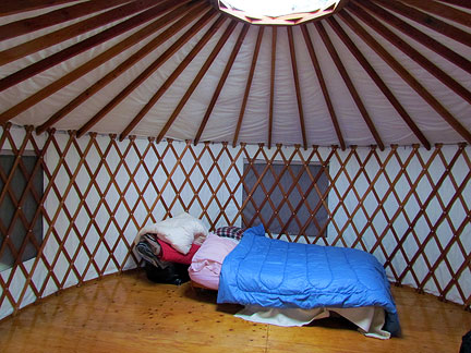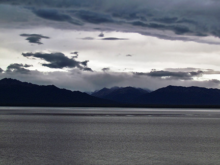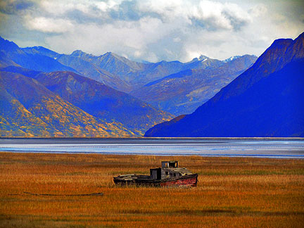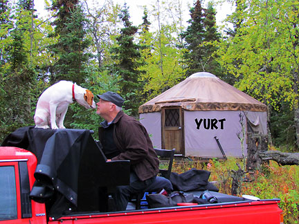 I reached Heidi and Dans house where I am staying before they got home from work so I headed to Cooks inlet named after captain Cook and met Noah a guy working at a small educational fishing site run by the Kenaitze indians. The truck bed inside was soaked from the rain, how it happened I do not know. (big pain in the ass) The area here is flat and for the first time a place that reminds me somewhat of the New Jersey shore areas back east. I wished until the drive ended... but could not capture my visual experience, the essence of massive mountains dropping straight down into water. As I was afraid would happen, one night only with my new friends... way to little time. We stayed up talking into the morning and probably if we had a few more hours (and energy) would have sunk into some heavy debate. As it was, I did most of the talking. They were perfect subjects for my ramblings being professional mediators... listeners for family, community, business and organizational level disputes and plannings. When I first drove into their driveway I thought, "crazy meets crazy." Ha, Along with their mediation business and other things, this is a family of fishermen. There is a super large fishing vessel sitting next to their house with fish netting around the property to try and keep moose out of the garden and... they have I yurt for me to sleep in. At first I thought, ugh but... wow! My first yurt experience. A yurt is a tent-like circular structure with wood lattice frames traditionally used by Turkic and Mongolic nomads in Asia. With the rain this will be one of the most sound sleeps I have had to date. Lamp light, electric, heat, down comforter, nature, quiet, my dog in a Yurt!... ahhhhh.