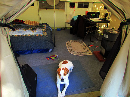 Coley gave me the run of his house which is well kept and his couch to use or... a tent set up down the way from his house in the trees a few feet from a babbling, luscious creek where I could hear running, splashing, gulping, jumping water all night long. I have seen these tents from a distance several times so far. They have given me the heebie jeebies as in, "what if the journey goes to the level of living in a tent?" Here I am staying in a tent! But... it is super amazing shelter with a plywood floor, carpeting, a huge air mattress with fleece bedding and blankets... a desk, table, chair, LCD lights, screened windows, bag for waste, paper towels, salt, pepper and an amazing thermal electric fan that works off an oil stove. I could have slept naked all night long without covers, ha! The tent has an unbelievable internet connection!!!