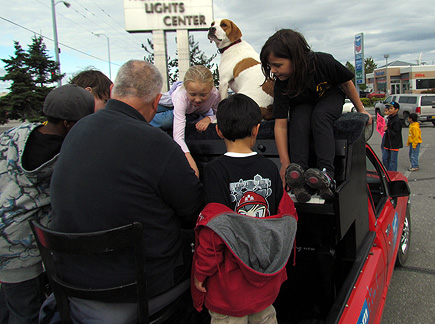 We drove right down on the track and got into line. We crashed the Homer, Alaska high school homecoming football game parade! It went really well even though the crowd was totally taken buy surprise. The announcer ad libbed amazingly well saying, "and now we have the Traveling Piano... Bring the Beat to the Street"... and then something nice about Mo and then I heard the crowd cheer and then... we were outta there. The young guy jammed on the trombone and his brother cheered while I played. Mom ran along with us taking pictures.