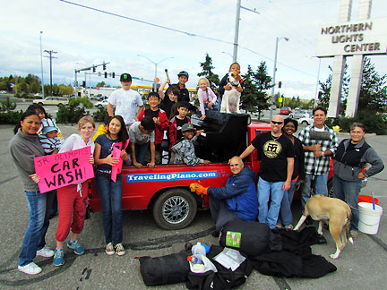 The day began with Leslie cooking sourdough pancakes from a starter over 100 year old. A starter is simply a self perpetuating yeast mixture that when mixed with flour and stuff creates dough over night... a special tradition here in Alaska that began in the old gold rush days at the turn of the century for survival. Today was the third time I was treated to this treat! Mo and I drove the Traveling Piano to an area today where a lot of homeless people were hanging out. For various and complex reasons there are more homeless people I've seen in Alaska than anywhere else. A fairly huge woman was sitting next to the truck in her wheelchair watching me and I asked her if she wanted to play some piano. She literally jumped out of her chair and used the sides of the truck to climb around it to get in the back. Someone from behind warned me that she was mentally ill. I said that I did not care. The woman began playing and really knew her stuff. Most everyone around was stunned. (they all pretty much all know each other, hundreds of people) I had to tell her to give someone else a turn and then someone told me that she probably soaked my seat pillow because she pissed herself. I thought, "damm I just purchased a new seat cover yesterday" but... the woman was not stupid, she knew she pissed herself and in fact was respectful. She had taken the pillow off the wooden piano stool before she sat down. "Whew" People are amazing.