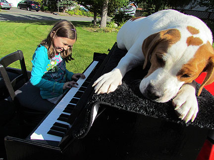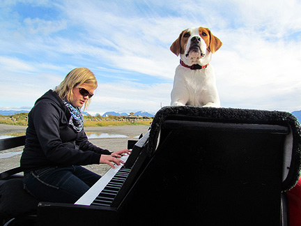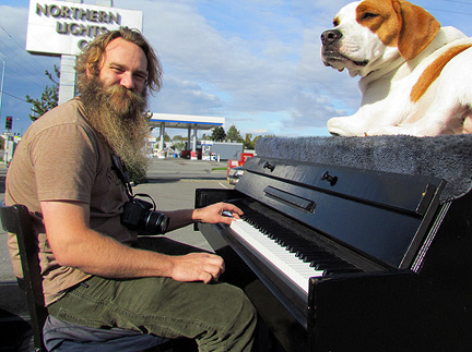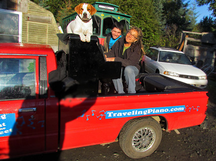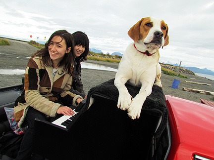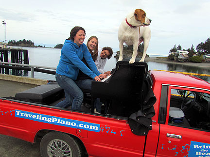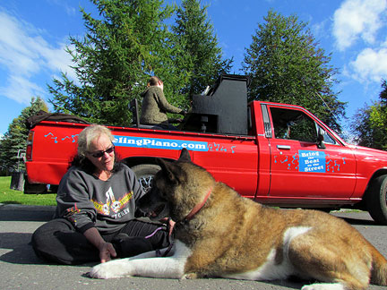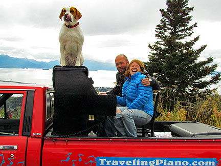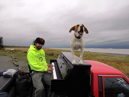 Piano Dog Mo... we have been partners now for one year! It is amazing to think about what has happened in one year. He now acts more like a playful adolescent than a playful child. This morning I woke at eight thirty, put on my clothes and coat, got myself out of the yurt and onto the truck to begin playing music. Ha, I think I set the record for the earliest Traveling Piano start. Dan had to leave to go work on a project and I wanted him to hear me play before I left and to also get a picture. Heidi came out to find music in the yard and Dan followed with his cup of coffee. It had just stopped raining. My sleep was short and ever so deep in the yurt where I stayed. Before leaving Heidi and I went into Kenai to the parking lot of a small business complex where I met some people she works with her sister in law and a few random passersby and then began to drive to Homer. Rain also began again and continues as I write this.