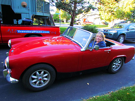 Afterwards I took Mo to the local dog park. This place won the "best of" to date award for a dog hangout. There were at least a hundred people around and some brought as many as five dogs. There was a wide long road, trails, a huge lake and field. Not one dog fought. Everyone was super happy. It was a sunny day and around sixty degrees and also very clear that people are milking the last days before winter. I noticed while driving... men doing yard work and sunning themselves without their tops on to soak in whatever warm rays of sun are left. When I returned back to Chrsitine's place I was treated to a ride in her red 1965 Austin Healey, super fun!