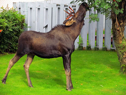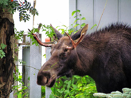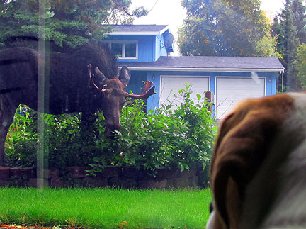 It was a Moose of a day. I've got a cold/flu whatever and as a result now bad thoughts are trying to swirl around... paranoia, fear, hopelessness, feeling a bit lost, alone, time to give up, where do I go, where can I stay, etc... no worries, I'll be fine. It is not fun when I don't have anywhere secure to cuddle into when I'm sick especially now when I don't know where I am going to sleep in two days. I was told the local news station aired my segment two more times this morning. Nice! God, I want to nest for a little while but where and with whom or by myself... pay? I've been feeling that a lot lately. Staying with people can be work, it is part of the journey. I enjoy my work. I'm conflicted over many things. Wintering here in Alaska to work and fulfill the iceberg dream, getting a book, movie, television show and other things going, or just keep going until I drop... working the journey till I drop takes one hundred percent of my time. To do anything else I would need to change focus and have a supportive environment. Outside the bedroom window today I woke up to a huge moose on the lawn. Check out the pictures on this Facebook link... The Moose is Loose