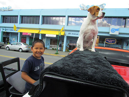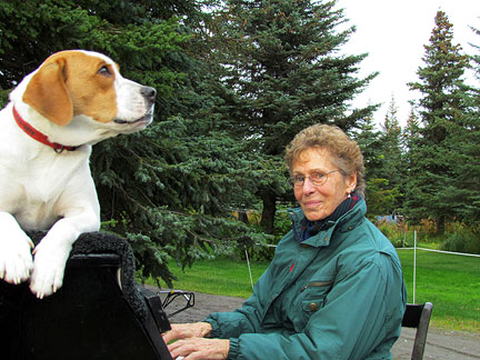 Onward... we hooked up with Sally today to stay with her and her son Alex. Many people will fling off my coincidences with "this is a small town" or "its a small world" but not me. There is something else going on. I don't quite know what it is and I'm not so sure it is important but... there is a guy very well know in Alaska named Johnny B a Ragtime, Boogie piano player like myself who used to travel with his piano around the country. His name has come up in conversation no less than fifteen times since I've been here. I emailed two newspapers who had done articles on him to try and get in touch. I was told he lived in Homer but moved away. Yesterday, at the high school homecoming parade I stopped to talk to only one person. She had a dog who's face I was drawn to. I told her she had a very special dog. I had never seen eyes with a spirit like in this dog. Well, guess what... Johnny B lives on one side of Susan, and the woman with the dog lives on the other side. Mo and this dog played all day long non stop. Mo also found a compost heap to roll in and also got into a heap of trouble because he left me for too long a time to run with the other dogs in the neighborhood who were showing him the rounds. Of course they all came back but Mo cannot have the luxury of leaving me for long periods of time in unknown environments.