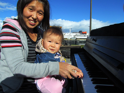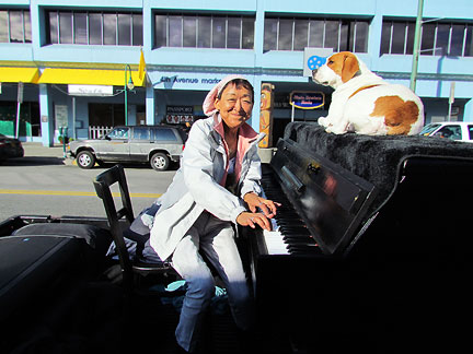 In a few days I will be taking the ferry to Soldovia, Alaska and after that a three night ferry trip to Juneau. People are saying I am crazy. It will be the last ferry crossing of the season for the Gulf of Alaska. I just cannot handle the rough roads again through Alaska to get to Haines for a shorter ferry ride sooo... I will be handling the rough seas instead. Sea sickness is big time for me. I called my doctor for sea sick prescription medicine. The woman selling me the prescription said, "so your going to be smoking water, eh"? I said, "yep choppy and rough sea." She came outside from work for a Traveling Piano moment.
