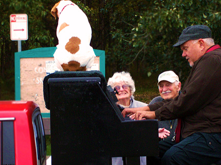 Back in the tent where I am staying I worked on pictures and dealt with an internet scam listing to sell a picture of the Traveling Piano with Mo and the website name front and center along with my license plate... as a greeting card and poster! Can we talk about confusing my non-commercial agenda? When I addressed the issue the guy sent a penny to my paypal account. You know what is going on there right? Enough said on that. I learned something new about walking with Mo in the woods. Bears have always been an issue but I never heard about moose being a problem. Moose do attack people and animals. If it should happen I need to run behind a tree because they can't turn fast... and those things can run fast! Ha, some Moose trivia that might save a life, even mine and Mo's.