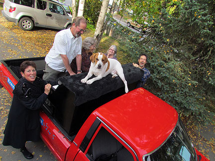 This changed everything because now I will stay in Anchorage and have time to visit Coley in Wassila, visit an elementary school I wanted to visit, get stuff done here like buy a new pair of sneaks and visit some spots in the city I did not have time for and not need to backtrack from Homer. If I can catch a ferry from Homer south and not have to back track through most of Alaska it will save an enormous amount of time and I won't have to worry about snow. I took Mo to the dog park. He hadn't been out in a few days because I was sick. We started to connect with people there. One old threesome, a husband, wife and dog, they were so fun and interested. The dog was holding himself up like and old bent over man, the guy had sticks for both hands and the lady began to dance when I played. She used to be a dancer and it was really joyful to see her come to life with the music! At Leslie and Jon's... neighbors came buy and also friends on a honeymoon. They got on the truck for a smooch. Lastly, hows this for a coincidence... Leslie and Jon are friends with Heidi who I will be staying with on the way to Homer. Wish me good synchronisity concerning the ferry system schedule. I heard they run only one day a month down south.