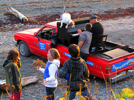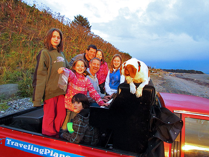 For some reason today the desire for "friend" was ahead of the "fun" and "respect" of this peregrinating mission. Onward to Bishop's Beach to meet a new friend Jay with four of his seven children for a hotdog roast on the beach. Jay called one of his daughters on his cell phone while we were there to tell her she should come and meet me. She told him that she had played on the Traveling Piano yesterday down on the spit! Along with several other people who passed by one woman took out here cell phone but instead of taking a picture she showed me a picture of me... a friend sent to her from Anchor Point the other day. It was one of the guys working on the road who got onto the piano himself. Now, I know Homer has less than 6000 people but still... what are the chances of these constant encounters happening and... I am never in one place for more than an hour or two. The Traveling Piano got stuck in the beach sand. When asking for assistance, Jays friend said, "you'll have to play your way out of this one."