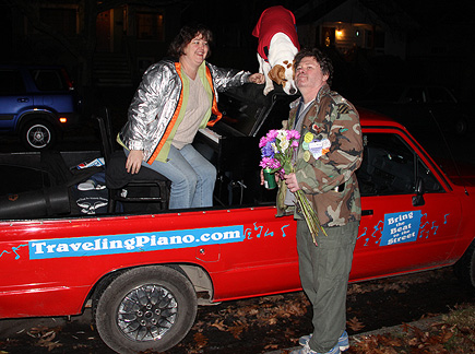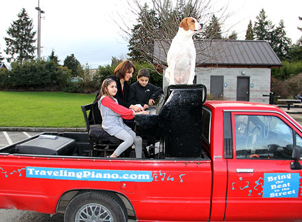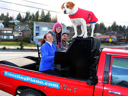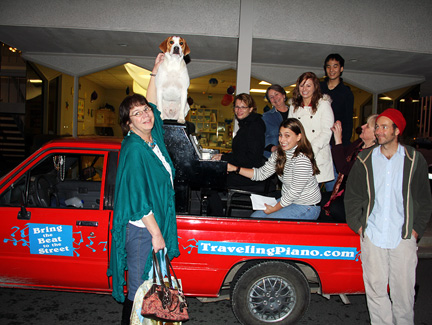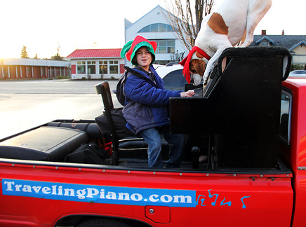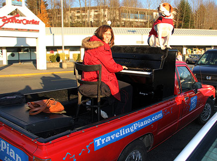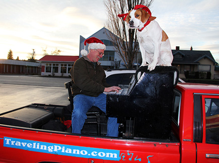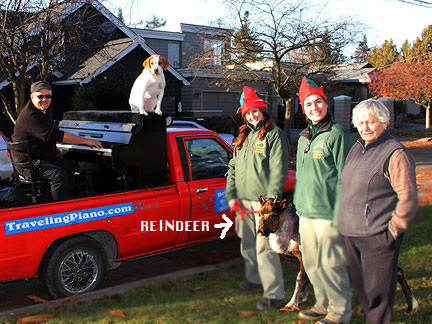 First thing this morning... hot yoga class! Funny I think. I've been breaking the exercise down to bear minimum exactly like I do with music for myself and with others. If I just go to the class and stay in it for the ninety minutes... if I don't leave and only attend... I have had a successful class. Today I was reminded about attitude. I can sit there for ninety minutes thinking about how hot it is, how much I'm sweating, things I need to do, how I have no energy or strength, am getting old, how I am tolerating, straining, trying, in agony oh, I could go on but... today I thought about enjoying what I was doing, that I care about myself and appreciate the most simplest of gifts... a breath of air. Afterwards I stopped at an auto store to get a cleaning cloth. Some guy walks up and says, "How was the drive from Pennsylvania?" He had seen the Traveling Piano truck in town a week ago and noticed the license plate. A conversation began, people appeared, I threw on Mo's reindeer antlers, people hopped onto the truck... the Santa Hat went on... Merry Christmas!