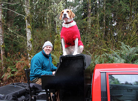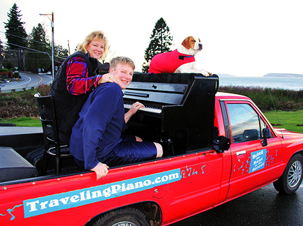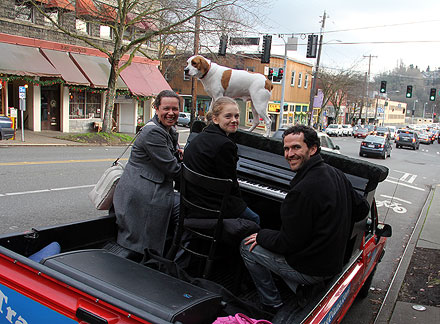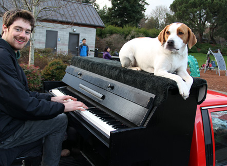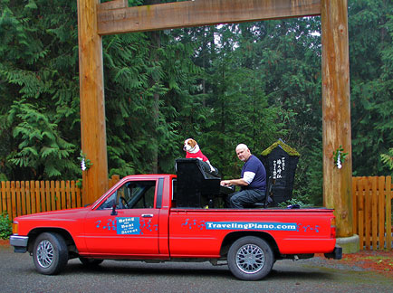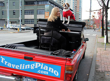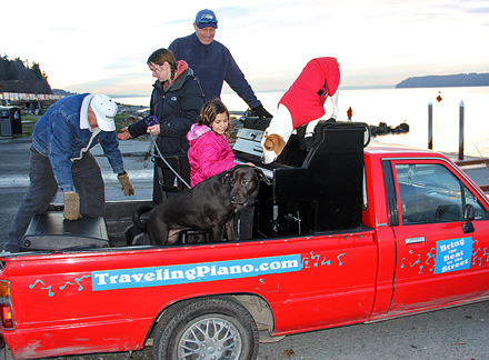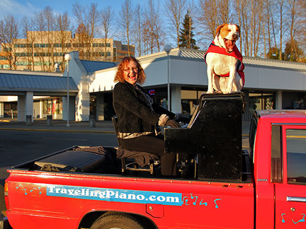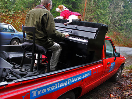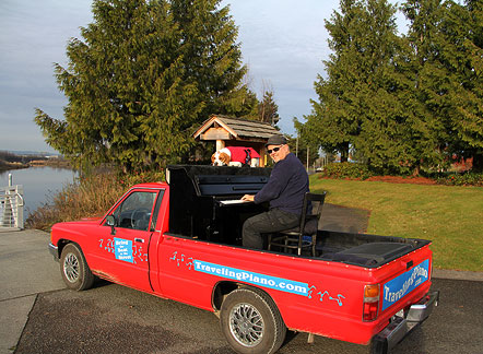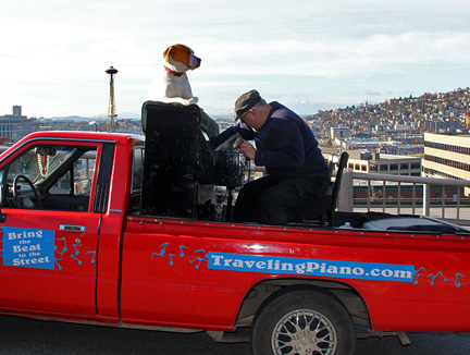 The news weather reported on television that it was a nice day today. Ha, I took the day off because it was dark, wet, foggy with temperatures in the thirties, thats a nice weather day in Seattle for this time of year. I took Mo for a long walk to a dog park. The buses downtown are free of cost for everyone. Dogs can ride free on the buses if they can sit in the passengers lap otherwise they pay the same price as people. I'm really liking this place! It felt really good to just hang around today. There is good walking here with hills, buildings and different scenery. I did enough work with the Traveling Piano yesterday for a week! A neighbor came over and I showed him the piano in the dark.