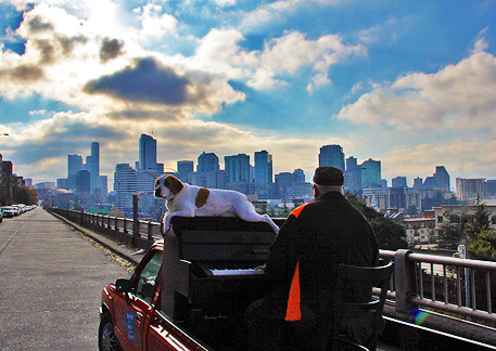 Headed back up to Capitol Hill to meet with a guy who had emailed me. People began to jump onto the truck immediately. It is very much fun for me when people who do not know each other get together on the truck and have an experience together. I drove four of them around the streets of Seattle while they jammed! At night I was leaving the city thinking about all the traffic I was getting into when at a corner I spotted a dog park Mo and I found a few days ago and then right there beside me a parking spot so... while the rush hour traffic crawled by I had fun with people on the Traveling Piano until dark and then Mo had some fun at the dog park while I watched the Seattle nighttime skyline light up, a beautiful sight!