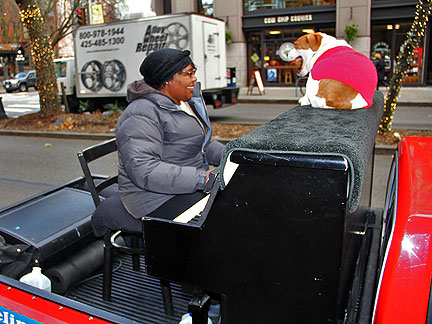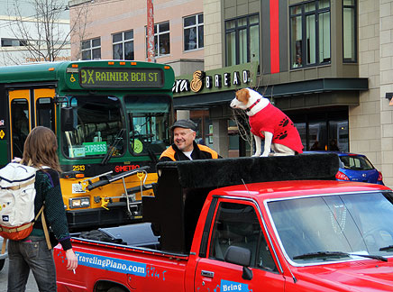 Mo waited in the truck. The most perfect parking spot was found twice! Only an hour was allowed in the first spot that was literally a few feet from all the shops. The second spot was on the end of a street at the curb... right on the outside of all the hustle and bustle. The day was full of joy with people on the Traveling Piano as well as off. While walking through stores and dealing with the crowds I remembered to breath and take my time, enjoy the holiday spirit and everyone I met. Every purchase came with some sort of fun conversational exchange, a smile, some laughing. I am happily smitten with Seattle, Washington.