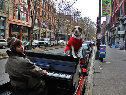 Seattle has been impressing me with interest. I really enjoy walking around in the city. If the sun was out I'd be playing around in it. Christmas keeps trying to get an emotional hold on me and thats not good because that translates into neediness. The same sometimes goes when thinking about Piano Dog Boner. As far as Piano Dog Mo... gratitude, love, passion, fun, friendship, respect emoting from every particle of my being in every moment!