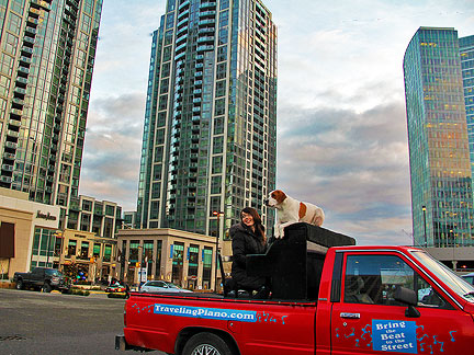 I found a huge parking lot with a 360 degree view of beautiful skyscrapers. After about fifteen minutes of creating music a bunch of Indian taxi drivers accosted me because I was in their space. They were operating their operation from the lot and my music did not fit in. I moved over to a spot farther away. It was very much fun watching people way up above in the skyscrapers discover a dog on top of a piano with a guy playing in the back of a pickup truck way down below in the middle of the parking lot. On the way out a woman came running up to thank me. We ended up driving to meet a bunch of volunteers at a homeless shelter for woman nearby.