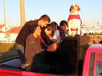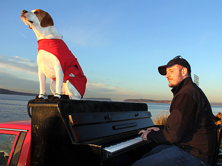 So, anyway onward... I got my act together by two in the afternoon and as soon as I began to drive the sun came out. I found a spot at the port in Everett. It was on the water and perfect. The music was perfect. The people who found us were perfect. The birds in the air and animals in the water were perfect. The sunset was perfect... Mo was perfect except for a brief roll on a dead fish...what a day! The people here in Washington state I've said it before have been extremely appreciative of the Traveling Piano being here. The first guy came up to me saying, "Man, thank you so much this really made my week, this is the way life should be." Ha, several port security personal joined up for some fun, a guy came from about a mile away telling me he could hear the music from way over on the north pier. It must have been bouncing off the cliffs from behind and he had to seek out the source. I thought, "Like a pot of gold at the end of a rainbow?" Love it.