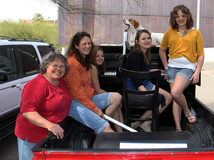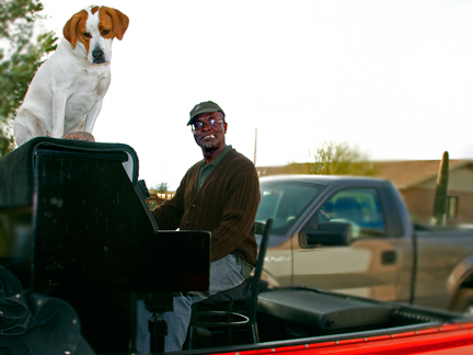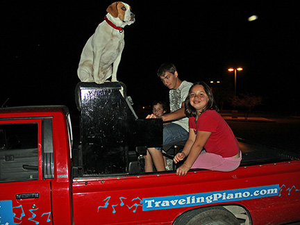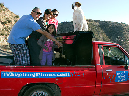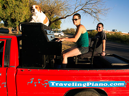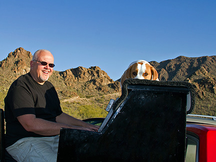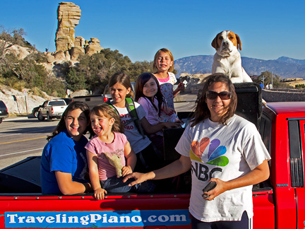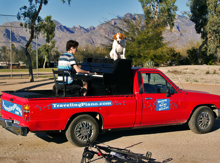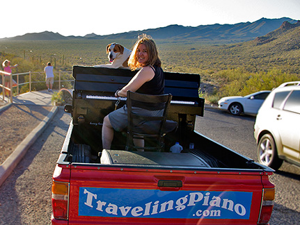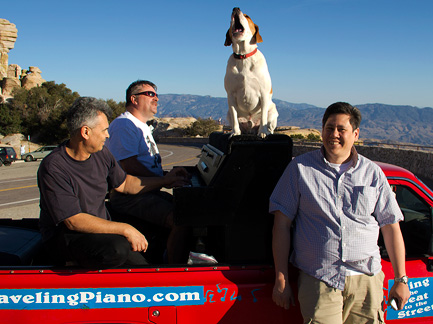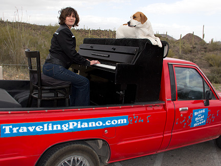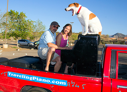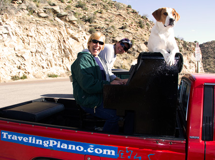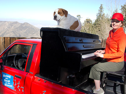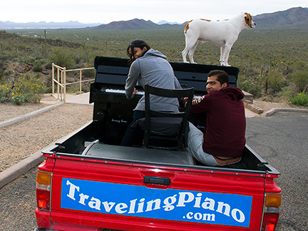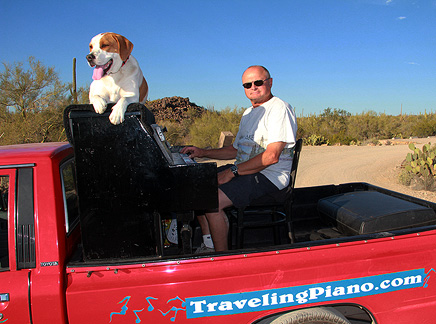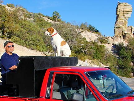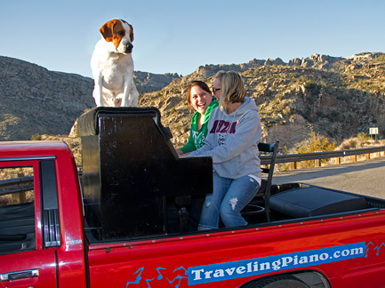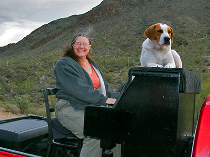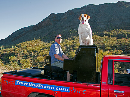 First the drama... I was standing behind the Traveling Piano truck having a conversation on top of Mount Lemmon. A nearby worker let a large trash container lid slam shut... twice. Mo jumped/flew out the truck window and began to run down a steep mountain side. I ran for him as I did not want to lose sight of him. The more I followed the more he kept going. I was worried he would get lost. He would not come to me. I had to remove the drama and chaos in my head while trying to coax him back. It took over a half hour before he returned to the inside of the cab, his den... his safe house. I was emotionally drained, so was he. I felt hurt it was painful because he would not come to me, he did not trust me, consider me a safe haven... or more importantly his den, the truck. I wished he would have jumped to the floor of the truck like Piano Dog Bo used to do. I was taking the situation personally.