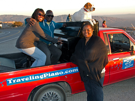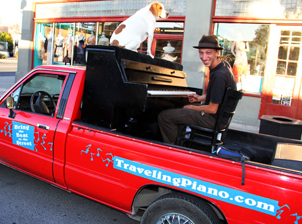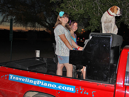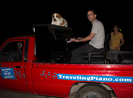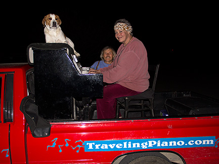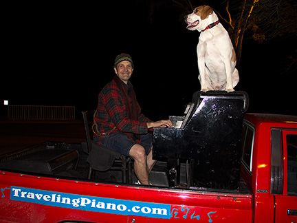 The sun was just the right brightness where I could watch it disappear without needing to look away. I could feel everyone there with me, totally with the music and the sun, sky... all of nature. I cannot remember having played for a total sunset with people around listening in complete silence. My thoughts were, "stay with it... care... don't let the fact that people are around get in the way of the music." Afterwards a very gruff guy came up to me in the dark to shake my hand and thank me as he handed me a twenty dollar bill. I especially love when people break down any stereotypical thoughts that still linger from time to time in my head about who will... or will not appreciate what I have to offer... and also their abilities concerning relationship and communication. I am very grateful that my music stands on its own and within its own uniqueness. The Traveling Piano served as a good connecter for people who had never before met to communicate. It was a good day!