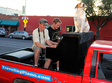 The last thing I did tonight was take Mo for a walk. One of the biggest things I have learned about dog stewardship is that dogs do not misbehave... they may get crazy, not think, go off track from any norm... the biggest cause is not having enough excersise. After yesterday I'm pooped but was able to shovel and rake some more stone today for the yard where I have been staying. The guys who were delivering the stone... I told them a few days ago I wanted to take them to a local Mexican food car for a Sonoran hotdog and some Traveling Piano music so thats what we did tonight. By mistake I ate a very hot and large jalapeno pepper with its seeds. That was not fun. The guys... when I was talking to them about the piano and my journey I was thinking, "wow, these guys their eyes are so alive with spirit." The smiles on their faces, they were lit up... so interested, inspired and stimulated with Traveling Piano type fun, friendship and respect. That is what they gave to me and it was very amazing... it was energizing and fulfilling. This was just another example of my pushing through feelings of being to tired to do something good. I always reap more than I could imagine from the inner push.