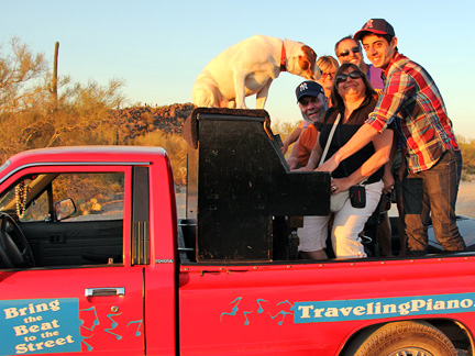 At sunset I took an hour walk along a dry river bed looking for a good music making spot I had passed a week ago. By the time I drove there it was almost pitch black. After about a minute of playing a guy walked in front of the truck speaking short Russian words with a white dog. Another figure appeared behind the truck and I was glad I had hid my valuables behind the truck seat as soon as I parked. The figure turned out to be a woman and she too was Russian. They were both immigrants now Americans with an accent. It was another synchronistic encounter. This couple had lived in Anchorage Alaska for six years and now here in Tucson for six years. I continually meet people from Alaska and Washington State here in Tucson. I suppose my visit up there is still strongly with me down here. They said they were almost unable to talk or think because of the music and their discovery. Hesitantly, she got onto the piano to explore and improvise for the first time. She was musically beautiful. I stayed with her for the first minute or so and then turned to talk to her husband. She tapped me on the shoulder and said, "Please stay with me here a little while longer I cannot improvise unless you are with me in the music." As it was her first time she needed the "we" element in her life for the music and was able to ask for it. Wow... love that.