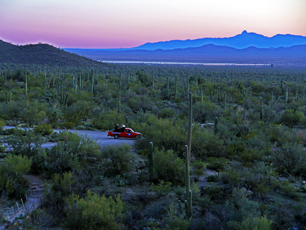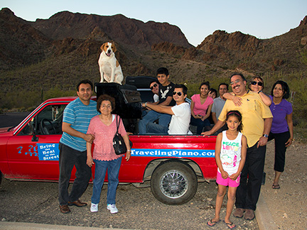 I was lucky to find a shady spot but he needs to stay in the truck with the windows open to wait for me. It is a priority, a necessity for this journey in warm places. I do not want to tie him up in the truck least he get tangled up and strangled. So that was all I thought about as we toured the Biosphere. It was really special to meet with Ranaga again and chat for a short time with his friends. Need to block out, pass through the memories of loss in that time period we originally met and remember the good stuff like Ranaga's fun, friendship and respect for me and the Traveling Piano. The ride home at sunset... wow. Driving by the Catalina Mountains was like driving along side a humongous stone wall straight up in the air. I wish I could show picture wise, natures foggy mountain shadows, the different shades at twilight. Beautiful....