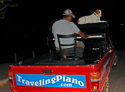 For the first time in a long time I played into the night without a coat on. Oh it felt so good the cool warm temperature. Did you know that potato chips if you forget to close the bag at night here do not go stale? It is because of the dry weather. Anyway, I met an accordion playing drifter, a classical piano playing guy named Daniel who I drove thought the streets and an alley while he played nervously because Mo kept walking back and forth across the piano while we drove. I met a filmmaker from Mexico City who had just missed her plane, a children's book writer and lots of locals... Mo had a tete-te-tete on top of the piano with a Mexican Chihuahua wearing a dress it was all just as good as it can get. One more thing... I had some fun talking about forgivness and respect!