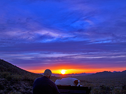 After finishing some yard work, the building of two new patios with stone and adding some esthetic touches, I checked in with Camille about my length of stay here in Tucson. She has really been helping me to free my mind to create my life. Her support of me through this journey is huge. Mo and I drove to a park at sunset. It had a lake and a fenced in area for dog play. I created music while thinking how musically different everything is today from my past life. Music was all about impressing, manic high energy... today it is about peace, relaxation, exploration... besides it being my own creative music verses the old Boogie Woogie and Ragtime... I wonder how todays music is affected by my age. I suppose it is a product of who I am today in many ways. A couple found us. They were self described as seductive, loving, uninhibited tramps forever. Sounds good to me! Ha, I played while watching blue herrings fly around. It was way dark before we left after having had a good long talk with another couple who not only brought their dog to play... they came to also play with dogs.