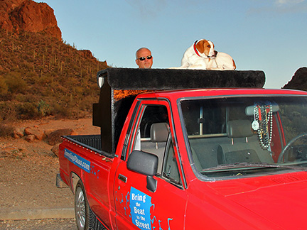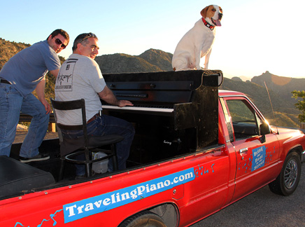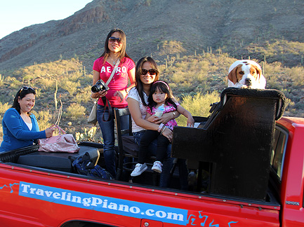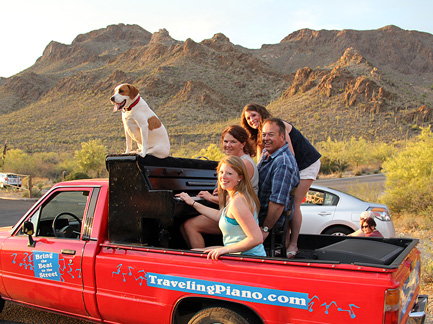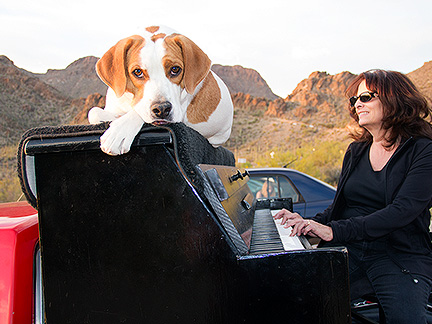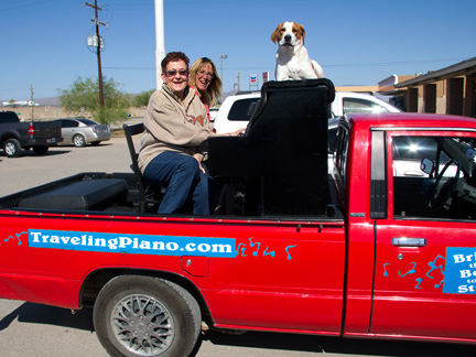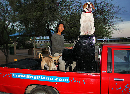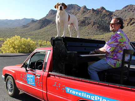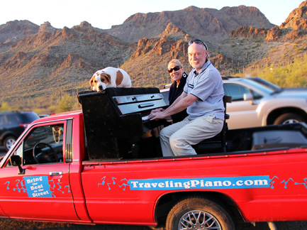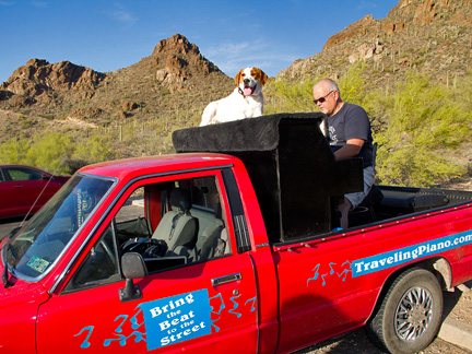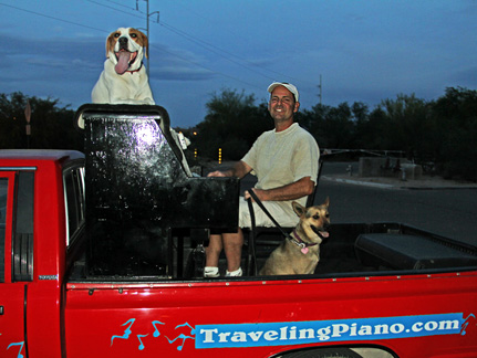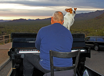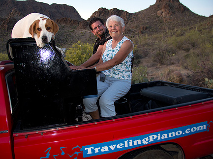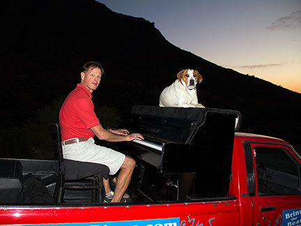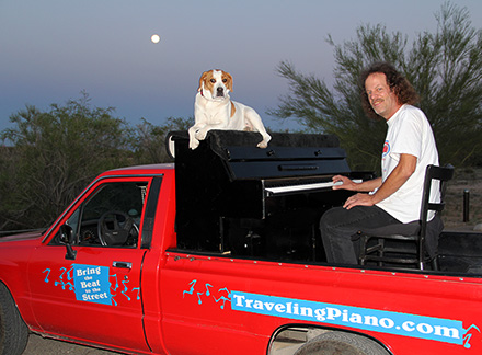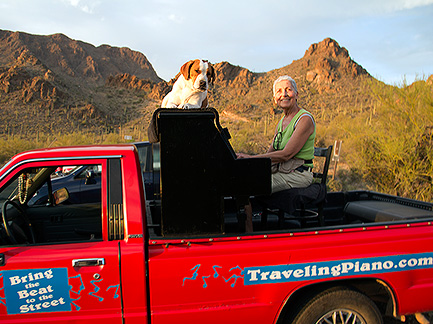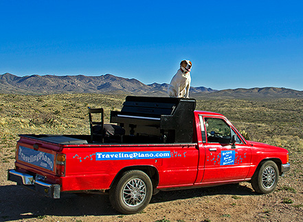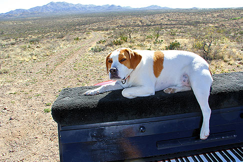 As the sun began to set I just stopped the truck and set up to play there was no way any people would find us so I thought. Three utility trucks came barreling down the road and I stopped them in the road to ask if they would please go slow pass the truck so as to not cover it with dust. One guy suggested I get the hell outta there because it was the time of day when all the drug smugglers made a run for it and the boarder patrols would be right behind them tearing up the road. He said if I was going to stay I had better pull off the road and back into the desert. I did. It was as hot (in the nineties) and as dry as it can get... as desert as I could ever have imagined. As I created music I fell in love in the moment with music and nature equally. There was nothing else, I was doing what I do, who I am totally content with being my myself with my pup sleeping in front of me on the piano.