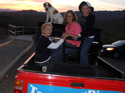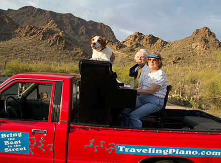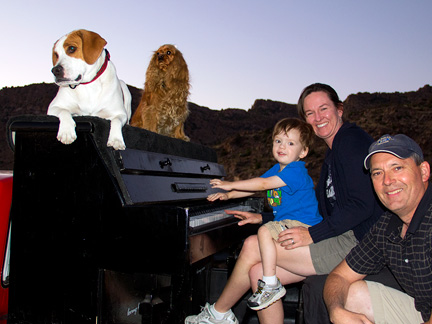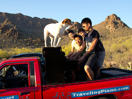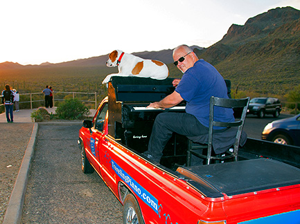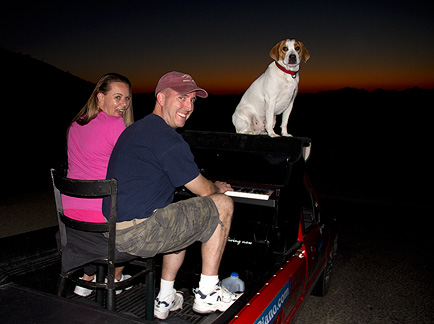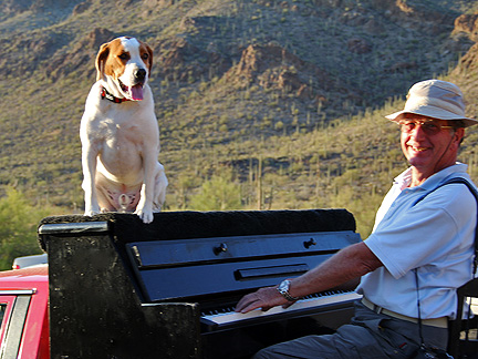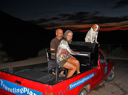 I started filling the truck again with premium gas as suggested and almost immediately it began to run better. To pay top dollar was suggested last year but somewhere along the way... in trying to save pennies I forgot. I jumped into Camille's back yard pool for a few seconds today for the first time and jammed the middle finger of my right hand on the bottom. Now both middle fingers are in constant "hurt" mode. So it is. We drove up to a favorite spot of mine on Mount Lemmon at Thimble Overlook. Being up 5000 feet in the air; the temperature was perfect. In fact tonight was an all around perfect Traveling Piano time. There were about three sets of people at a time having fun in meeting each other and playing with the piano. An experienced piano man returning from a day long hike and dinner with his wife wondered over to the piano and began to play along with me from the side of the truck. In his words, "I was drawn like a moth to the flame. No thought given at all as I joined you." Hahaha... I loved it! He suggested that we both imparted a new meaning to the term "mountain music."