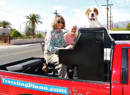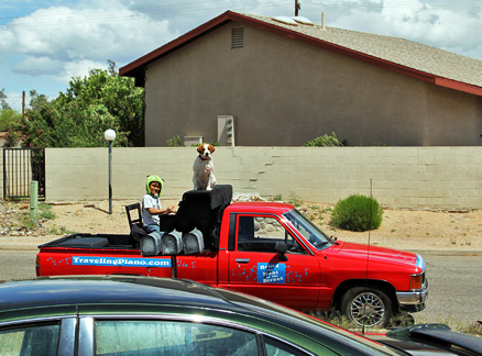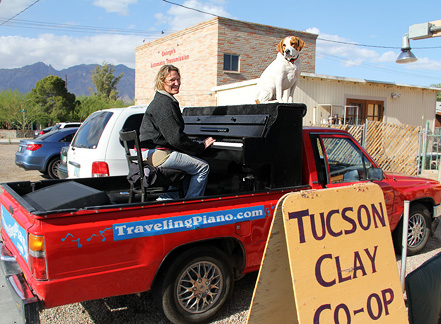 Well, it was an easy day with no Traveling Piano out anywhere. I took a day off for the first time in almost two weeks and it felt good! The weather was perfect. To just sit and enjoy it was the best. I created some music for the website, of course I work with pictures everyday... Mo and I took a leisurely walk and everyday I've been packing the truck to leave Tucson. Having had everything I own out and spread around in a space of my own for a couple months... wow it was nice! Problem... I have collected some containers of powdered meal supplements, two pottery coffee mugs I purchased and additional informational flyers that take up about a foot of space. I have !!!..."no"...!!! space for these items in my small truck! People will give me a piece of paper and I say, "no room for it." Anything I cannot pack away and that sits in the truck bed or cab just creates a feeling of clutter, chaos and gets in the way of my functioning. I was watching a television show with Sidney Poitier tonight and heard him say... When I die I will not be afraid of having lived. I like that.