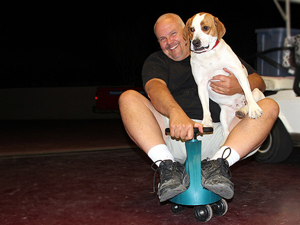 Ivy (Cory's sister) Shayna and Lawson sat on the back of the Traveling Piano playing music as I drove them through their gated community. We visited friends and almost met the next door neighbor who came out to investigate the "driveway music"... Mo discovered her peeking over the wall... we invited her over but she declined and then the family friends arrived. The kids turned me onto their PlasmaCar. It is a childrens toy that runs forward, backwards, all around depending on the riders ability to wiggle. They all joined me with me in playing with my toy (the Traveling Piano) it was only fair play for me to join them with theirs.