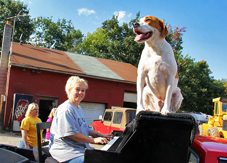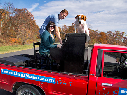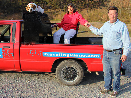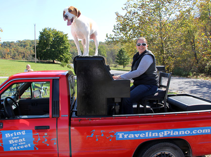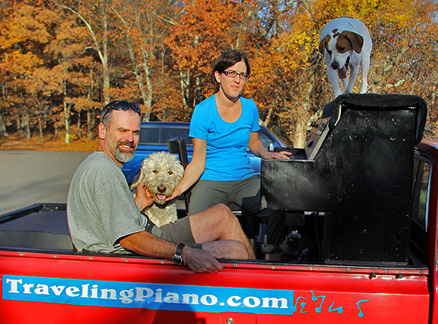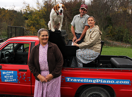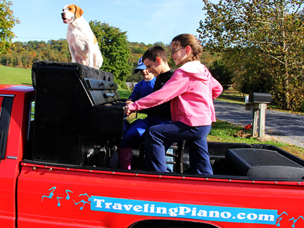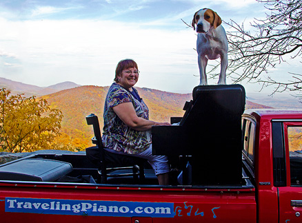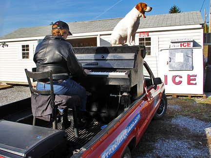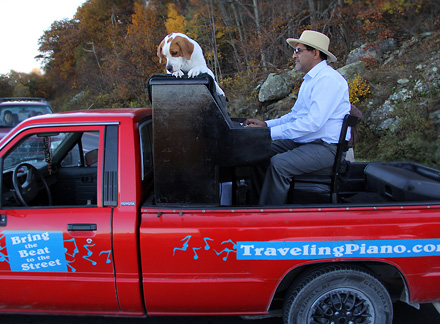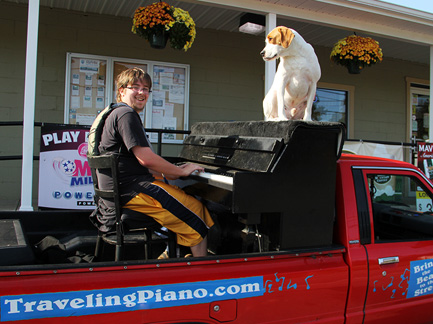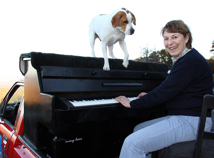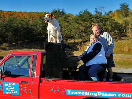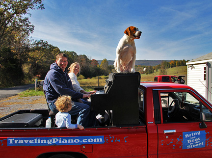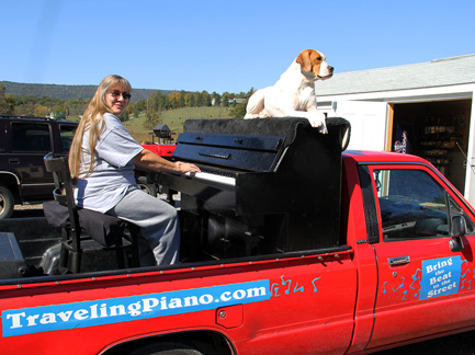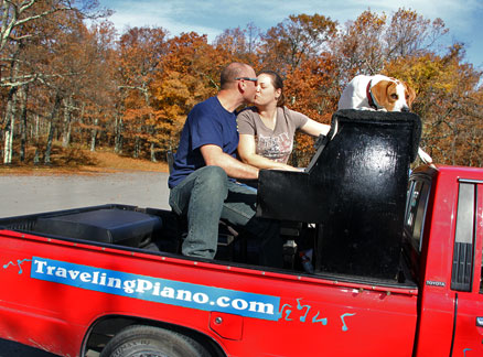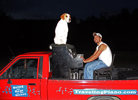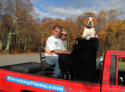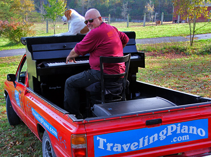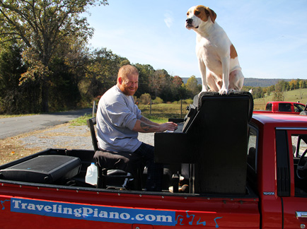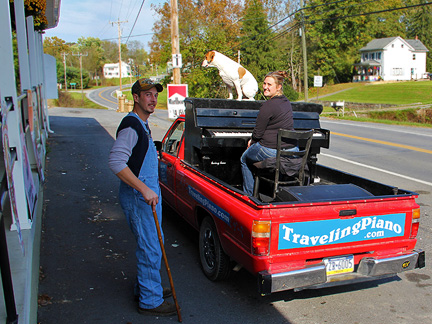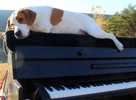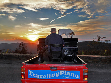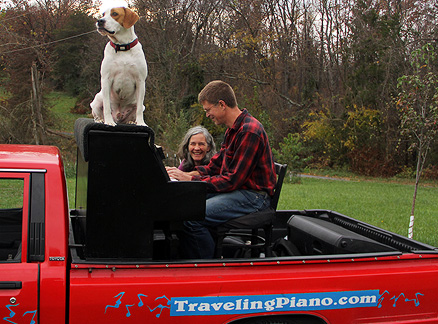I put the package address into my GPS and there was no such address. I turned down a country road I had never been on before to see if I could feel my way to the address. The road turned to dirt. A truck came driving in the opposite direction and I stopped to ask the guy if he had ever heard of the road the address was on. He said no and has lived in the area for many years and he had an old piano in his house he was looking to get rid of. I followed him to his house and pounded out the Maple Leaf Rag like I always enjoy doing on old dying pianos. The guy was seventy three years old and his name was Junior. His wife of fifty some years had just passed away in June. It made me think of my friend Larry and his wife Arlene who was being buried back east in the very moment Junior and I met. The experience was all an odd mix of Junior, his wife, their old piano, the music, my close friends Larry and Arlene, my meandering down a random road, the Traveling Piano, Junior's dog joining Mo on top of the piano and... the package.