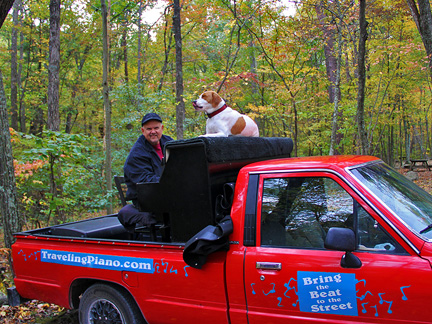 The fall season with its color... outside the windows... Mo and I must get out everyday to be in it if only for a few minutes. I have been putting the Traveling Piano galleries into a time line. Having had no idea what this journey would manifest... I first began categorizing the pictures into links like "Piano Players," "Danny and Mo," "Scenery," "Miscellaneous..." and then it got into years with like forty links and now I am putting everything into a time line so the pictures can be viewed like a story for people who do not read English. Check out 2011... it is a colossal documentation of this journey in clickable thumbnails that open up into high resolution pictures. Almost twelve thousand pictures from last year... I'll need to break it into several galleries eventually. It may take a while for the whole page to download. No wonder I have not yet recovered from last years travel! When you see the whole years story you will know what I mean! All of 2011 is done. Boner The Dog Galleries