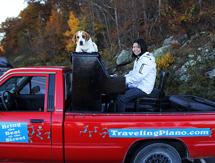Two people contributed some money which is unusual as I never solicit or ask for any and... a guy slipped some special weed he had inside the truck under the dashboard for me, for later. On the way home I brought a pizza, got some gas and had to throw the pot out the window. Ouch, that always hurts because it has value, I would love to get high and it was a generous gesture but... I have not smoked in thirty years and... did that, done that, hope to never do it again. (not that there is anything wrong with it for other people) There was a lot of video taking more than just photos of us today which makes sense because my music makes for a perfect, natural, outside, nature scenery soundtrack. Ha! I was dressed for fall weather and it was tea shirt weather. There was a constant battle between Mo, lady bugs and stink bugs on the piano rug Mo uses to not slip off the piano. The bugs where flying up from the mountain brush by the thousands. The diversity of people was amazing. A group of orange robed monks from Thailand found us. I so much wanted to get them onto the piano but they were on a tight agenda. The one monk tried to get out of my request of a photo of him playing the piano by saying he was a monk. I told him that was ok I'd still let him get up onto the piano. Ha, I knew deep down that was a no win situation but... it would have made for a great picture the orange robes, red truck, autumn colors. Guess I will just need to wait until I get to China for a few "Monk on the Traveling Piano" type pictures.